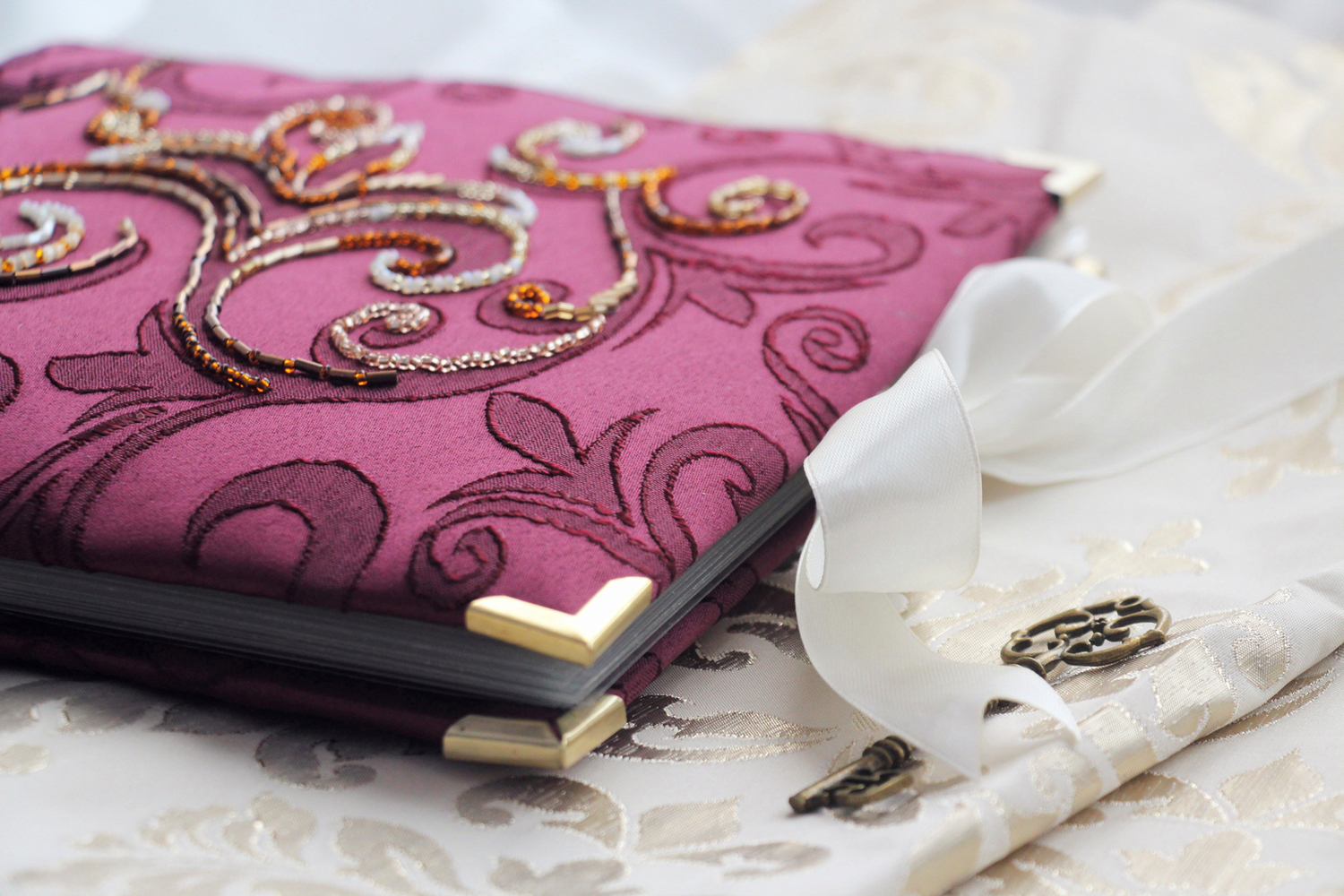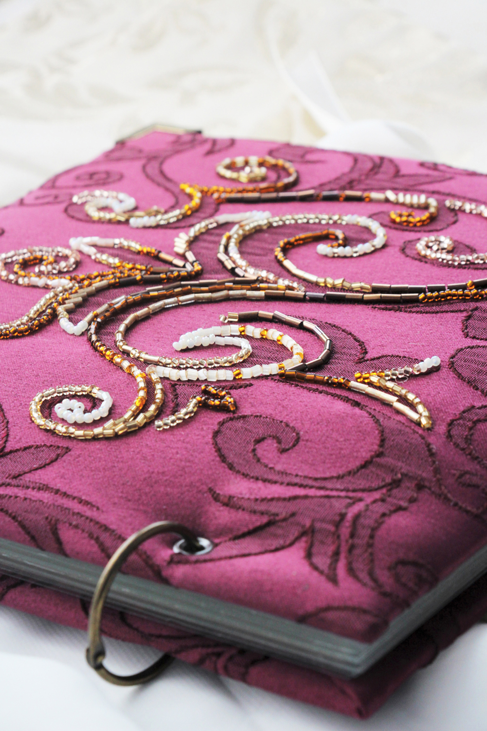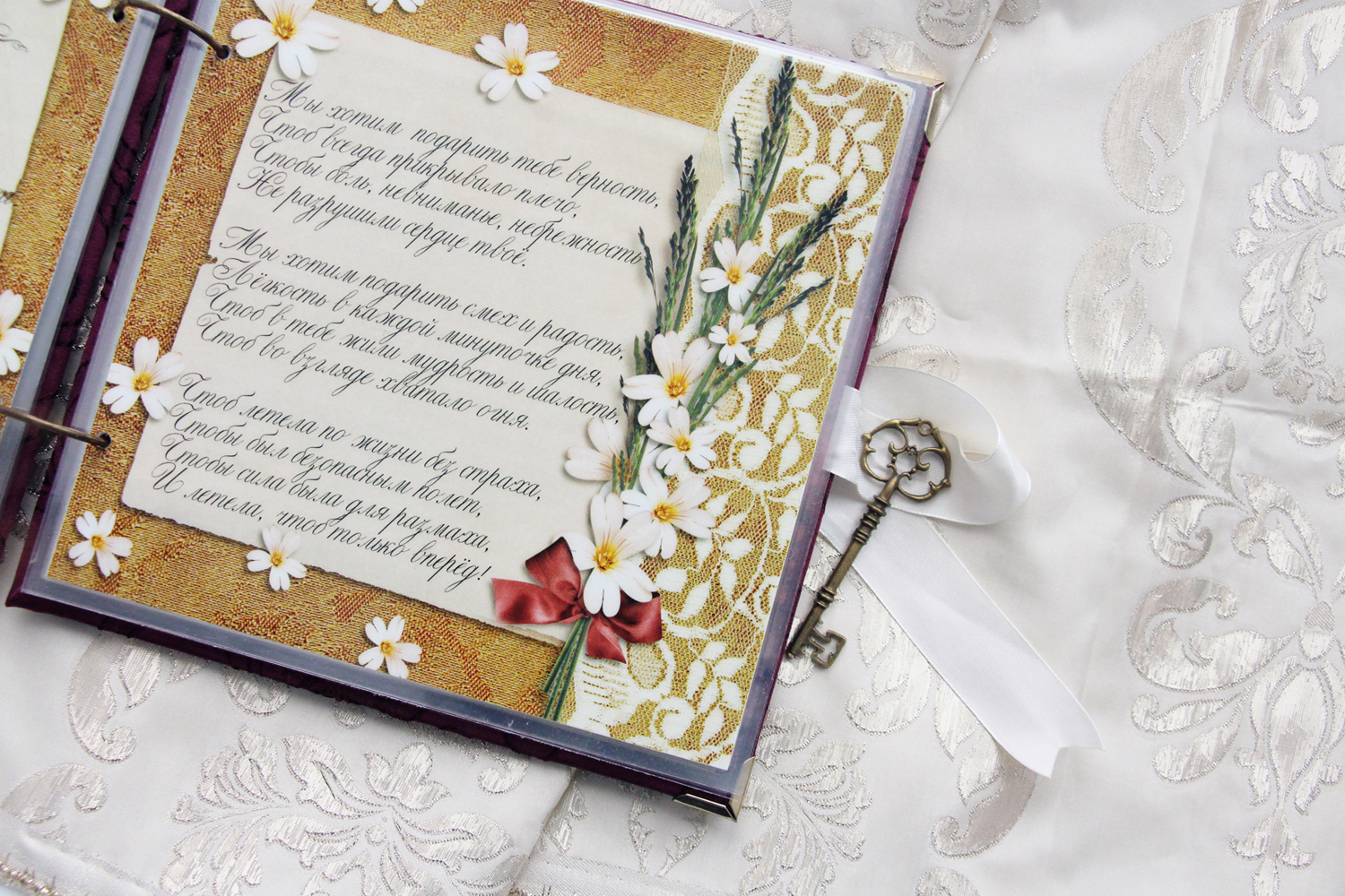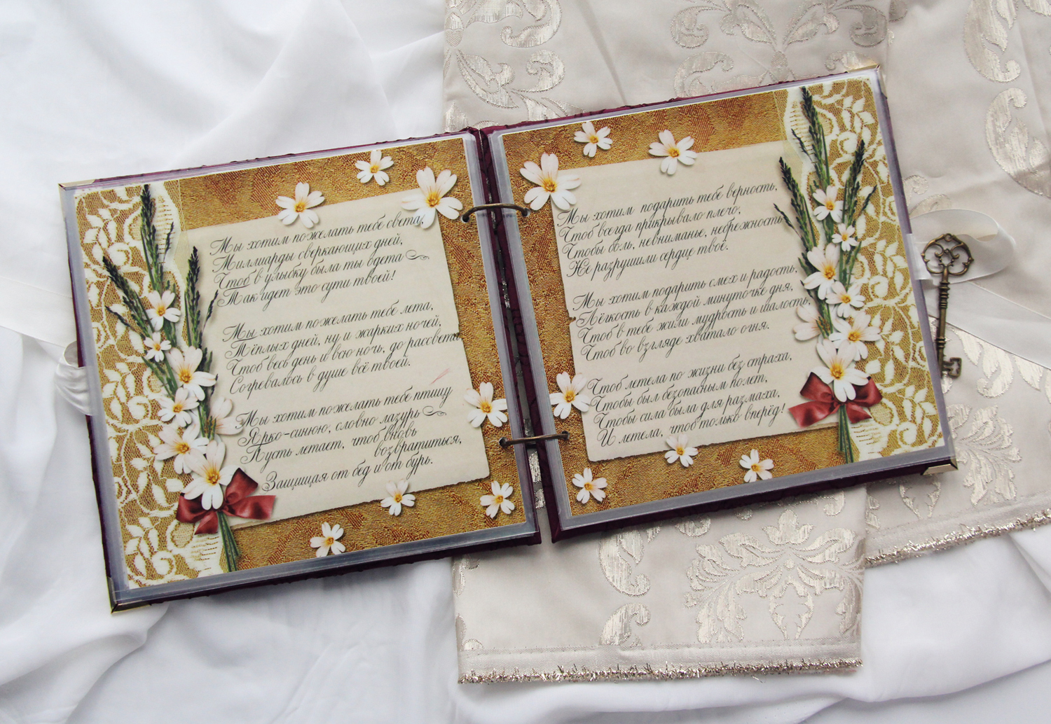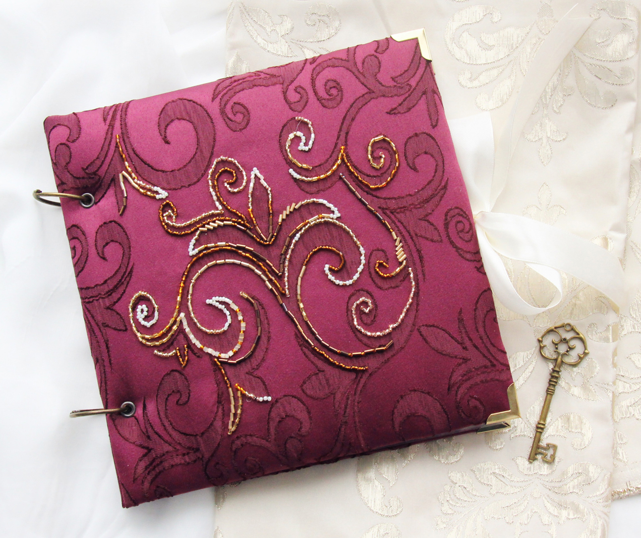 Один из подарочных альбомов, которые мы с коллегами традиционно дарим юбилярам. Обложка вручную расшита бисером, внутри - ламинированные страницы с фотографиями и поздравлениями. Размер 20х20 см, толщина около 2.5 см.