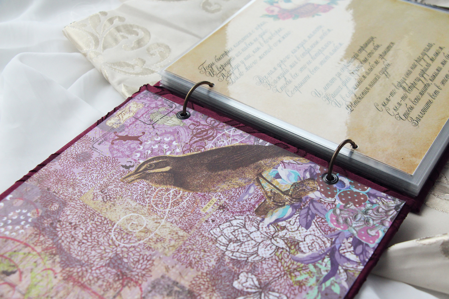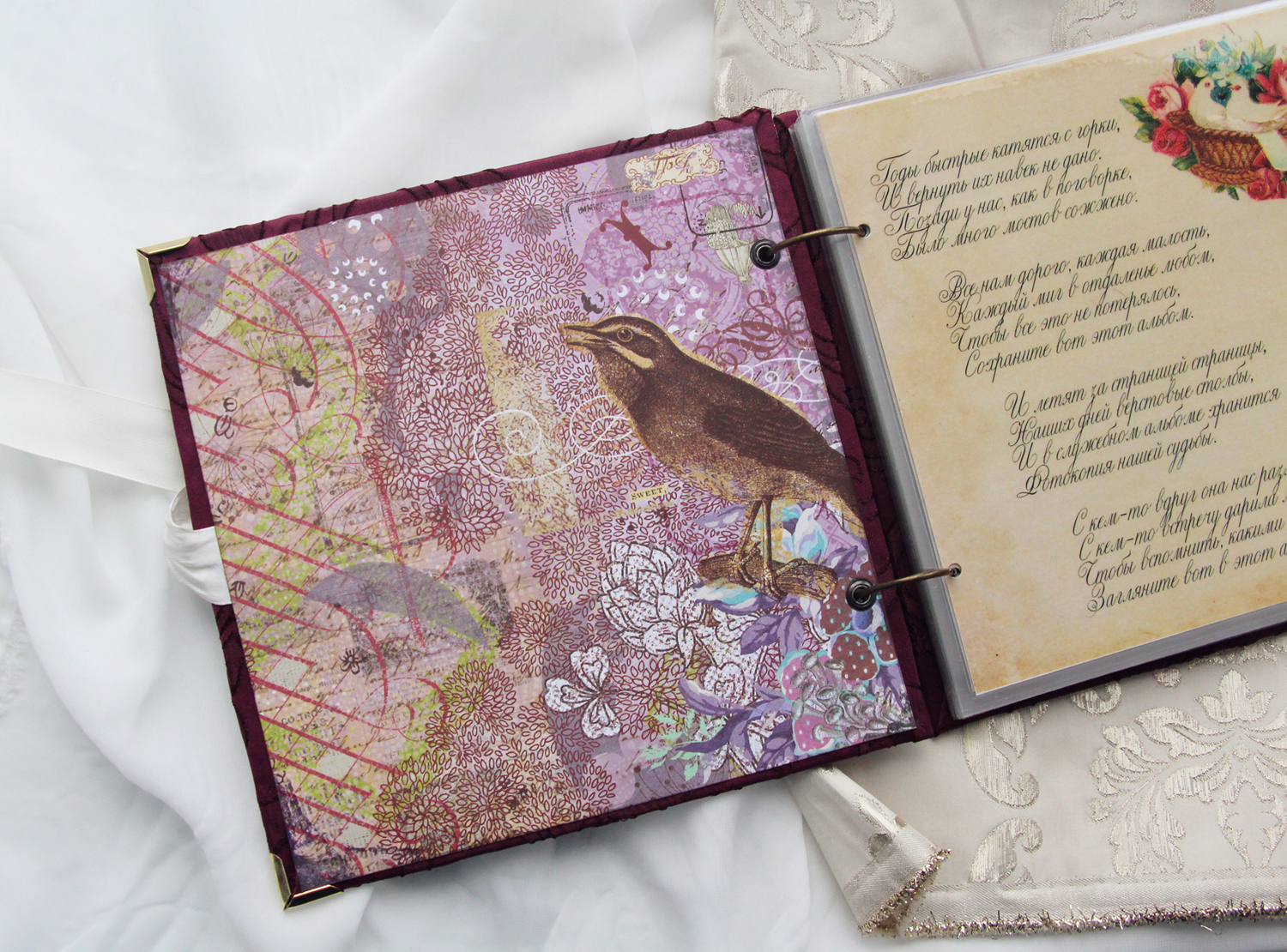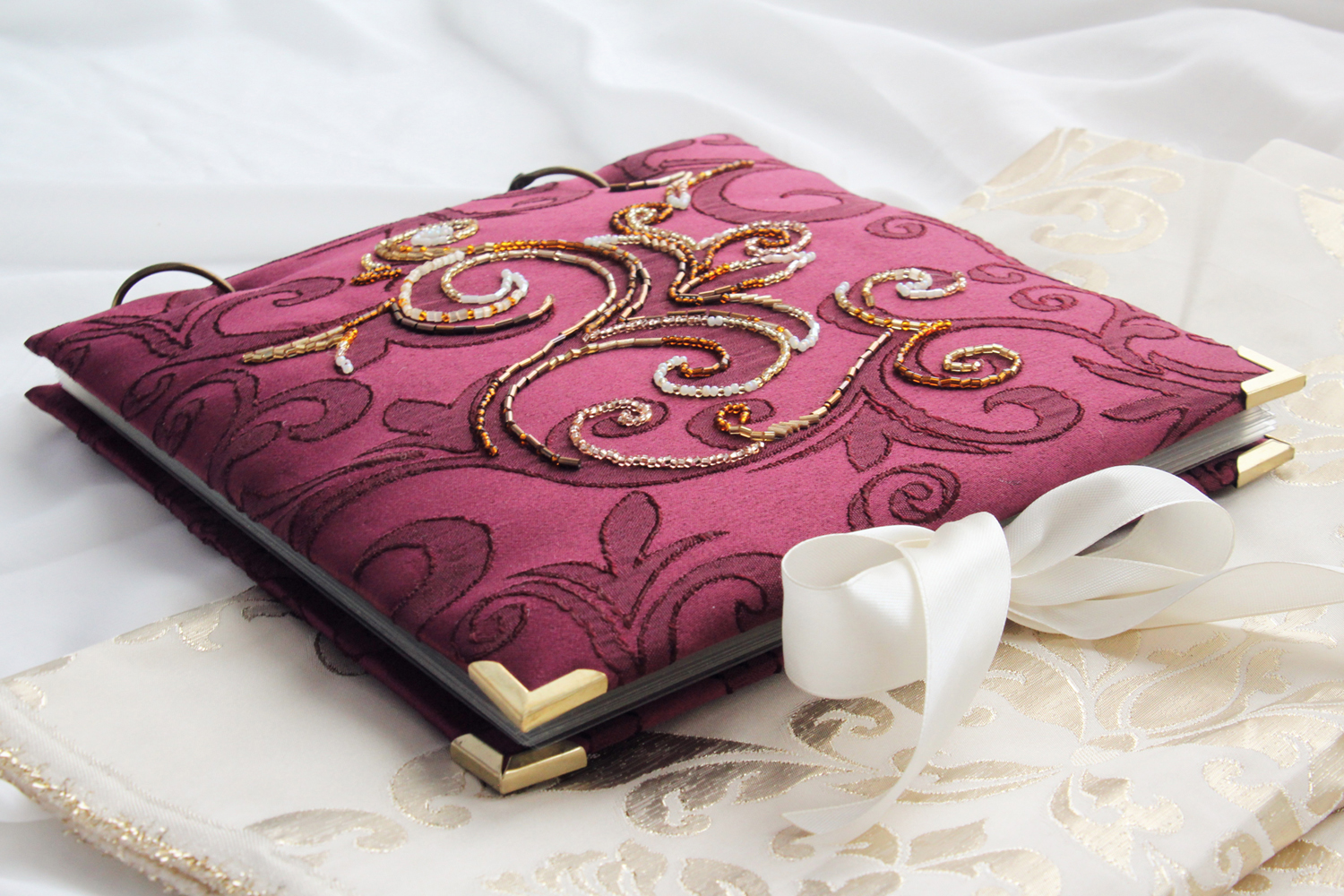 Один из подарочных альбомов, которые мы с коллегами традиционно дарим юбилярам. Обложка вручную расшита бисером, внутри - ламинированные страницы с фотографиями и поздравлениями. Размер 20х20 см, толщина около 2.5 см.